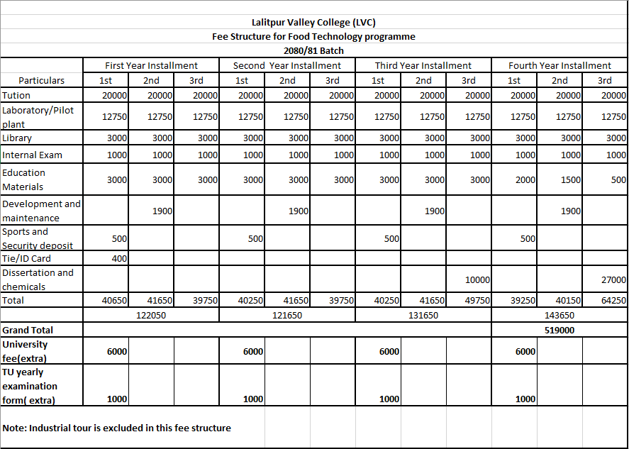 Fee structure for Food Technology Program 2080/81 Batch