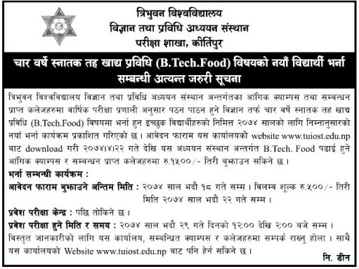 T.U. has announced an important notice regarding the entrance of B.Tech in food.